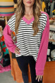 Black Stripe Textured Knit Twisted Rib Contrast Patchwork V Neck Long Sleeve Top