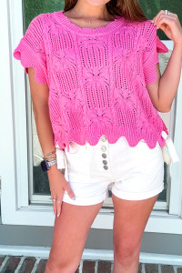 Bonbon Pointelle Knit Patterned Scalloped Trim Short Sleeve Sweater