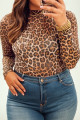 Brown Plus Size Mock Neck Leopard Mesh Top