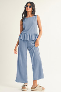 Duffel Green Solid Color Ribbed Ruffle Tank Top and Pants Set