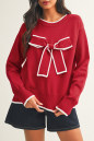 Fiery Red Contrast Trim Big Bow Accent Holiday Cropped Sweater
