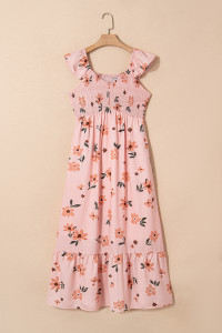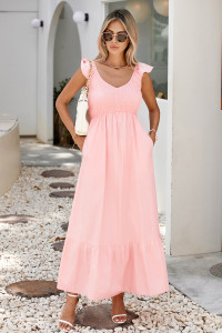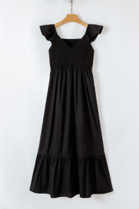 Fiery Red V Neck Flutter Sleeve Smocked Bodice High Waist Ruffle Maxi Dress
