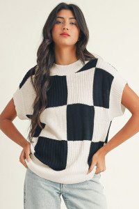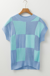 Khaki Checkered Color Block Crew Neck Short Sleeve Sweater
