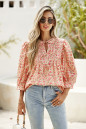 Light French Beige Floral Print Bow Pintuck Bust Half Puff Sleeve Blouse Top