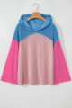 Pink Color Block Patchwork Corded Knit Loose Fit Hooded Blouse