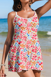 Red Floral Print Ricrac Trim Spaghetti Strap One Piece Swim Dress