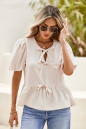 White Bow Tie Short Puff Sleeve Ruffle Hem Blouse