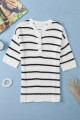 White Stripe Henley Buttoned Placket Drop Shoulder Bracelet Sleeve Knit Sweater Tee